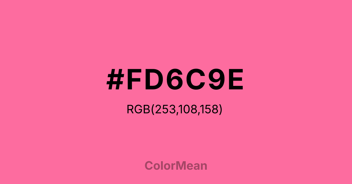 French Pink (#FD6C9E) RGB value is (253, 108, 158). The hex color red value is 253, green is 108, and blue is 158. Its HSL format shows a hue of 339°, saturation of 97%, and lightness of 71%. The CMYK process values are 0%, 57%, 38%, 1%.