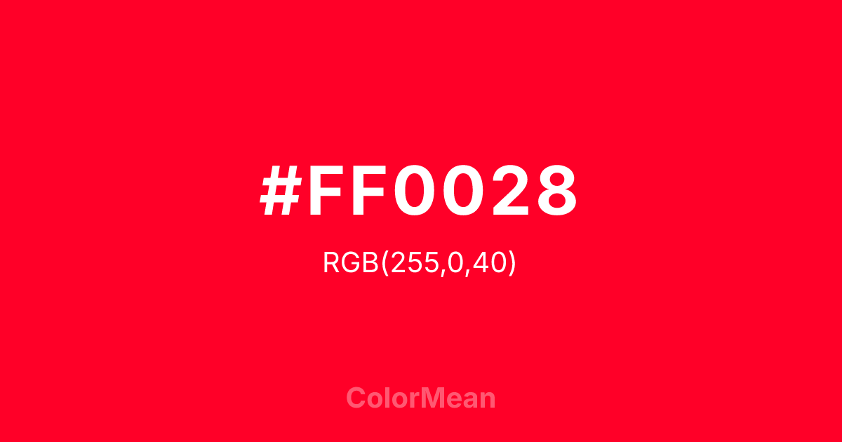 Ruddy (#FF0028) RGB value is (255, 0, 40). The hex color red value is 255, green is 0, and blue is 40. Its HSL format shows a hue of 351°, saturation of 100%, and lightness of 50%. The CMYK process values are 0%, 100%, 84%, 0%.