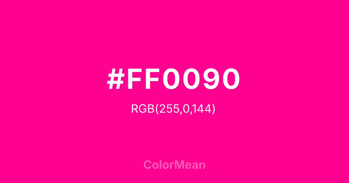 Magenta (Process) (#FF0090) RGB value is (255, 0, 144). The hex color red value is 255, green is 0, and blue is 144. Its HSL format shows a hue of 326°, saturation of 100%, and lightness of 50%. The CMYK process values are 0%, 100%, 44%, 0%.