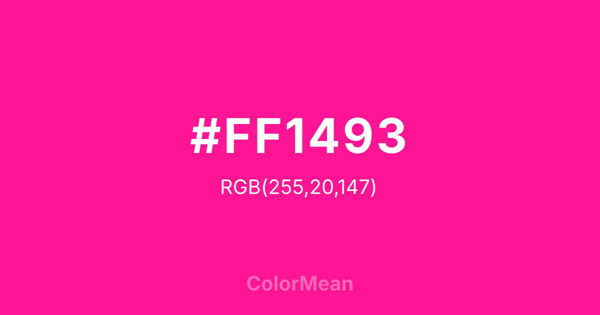 Fluorescent Pink (#FF1493) RGB value is (255, 20, 147). The hex color red value is 255, green is 20, and blue is 147. Its HSL format shows a hue of 328°, saturation of 100%, and lightness of 54%. The CMYK process values are 0%, 92%, 42%, 0%.