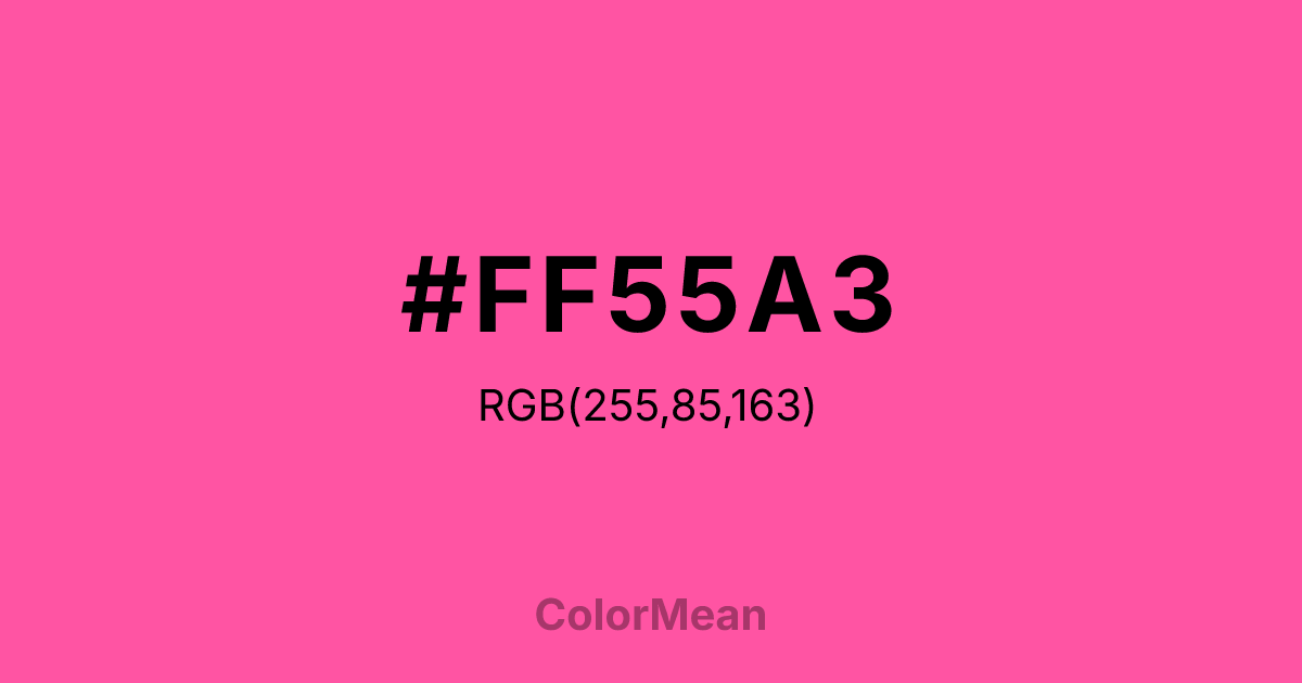 Magenta (Crayola) (#FF55A3) RGB value is (255, 85, 163). The hex color red value is 255, green is 85, and blue is 163. Its HSL format shows a hue of 332°, saturation of 100%, and lightness of 67%. The CMYK process values are 0%, 67%, 36%, 0%.