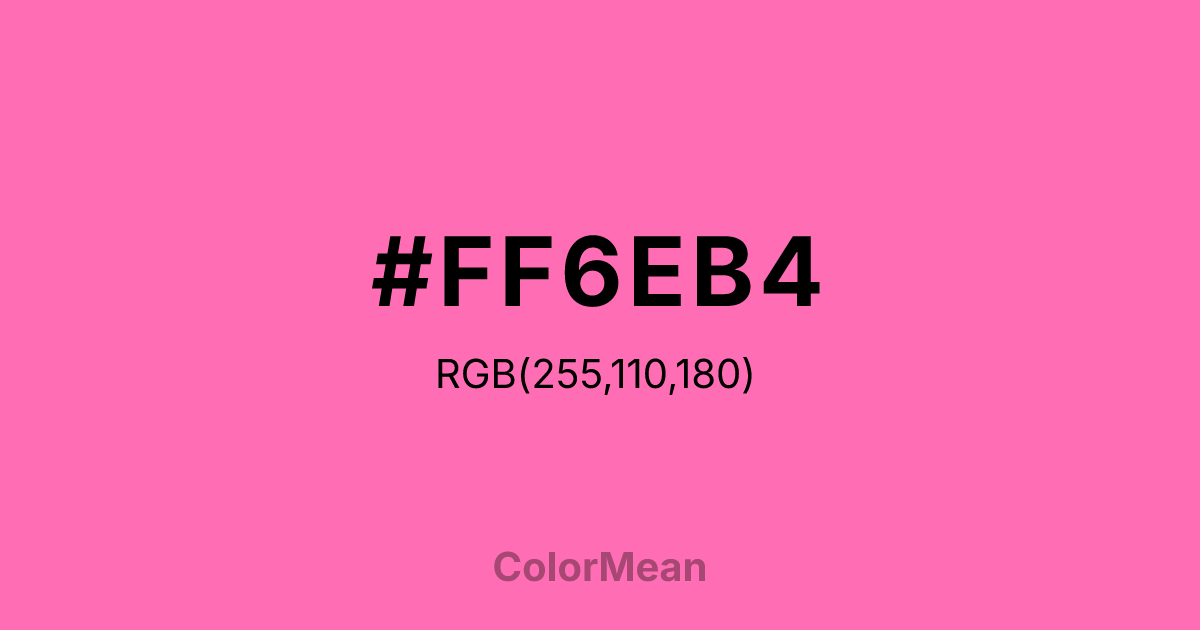 Hot Pink1 (#FF6EB4) RGB value is (255, 110, 180). The hex color red value is 255, green is 110, and blue is 180. Its HSL format shows a hue of 331°, saturation of 100%, and lightness of 72%. The CMYK process values are 0%, 57%, 29%, 0%.