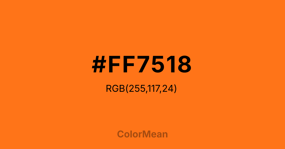 Pumpkin (#FF7518) RGB value is (255, 117, 24). The hex color red value is 255, green is 117, and blue is 24. Its HSL format shows a hue of 24°, saturation of 100%, and lightness of 55%. The CMYK process values are 0%, 54%, 91%, 0%.