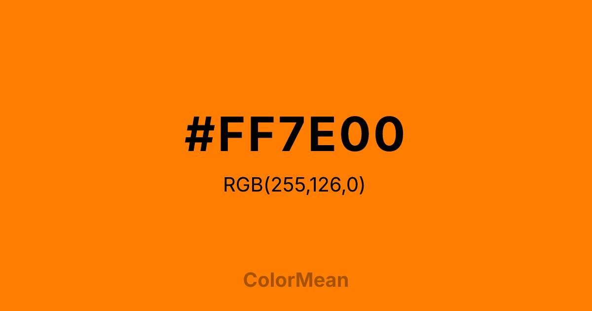 Amber (SAE/ECE) (#FF7E00) RGB value is (255, 126, 0). The hex color red value is 255, green is 126, and blue is 0. Its HSL format shows a hue of 30°, saturation of 100%, and lightness of 50%. The CMYK process values are 0%, 51%, 100%, 0%.
