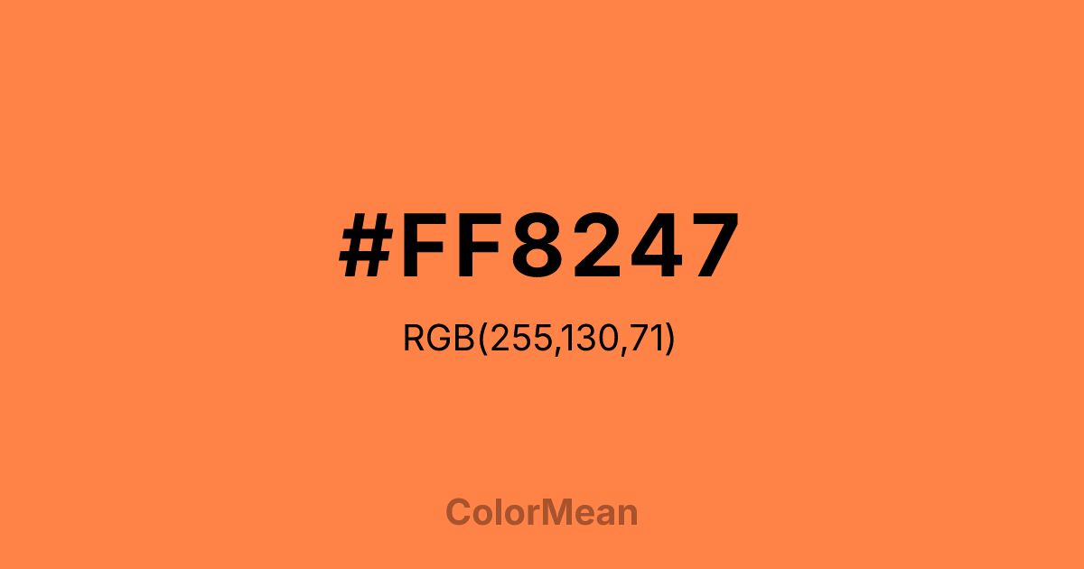 Sienna 1 (#FF8247) RGB value is (255, 130, 71). The hex color red value is 255, green is 130, and blue is 71. Its HSL format shows a hue of 19°, saturation of 100%, and lightness of 64%. The CMYK process values are 0%, 49%, 72%, 0%.