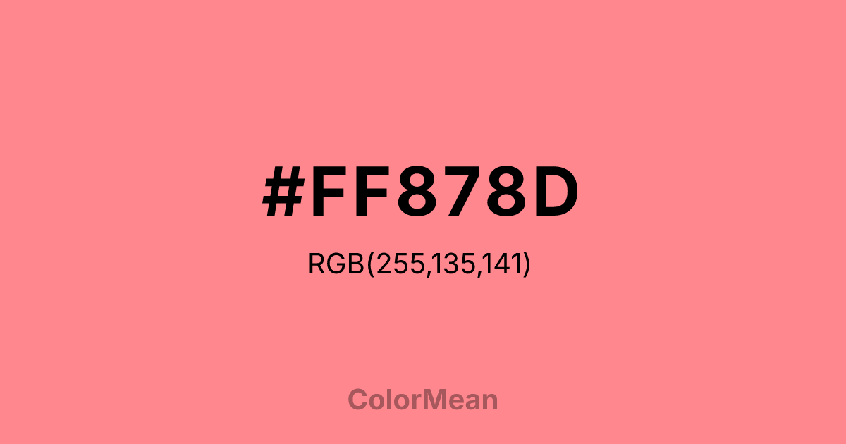 Tulip (#FF878D) RGB value is (255, 135, 141). The hex color red value is 255, green is 135, and blue is 141. Its HSL format shows a hue of 357°, saturation of 100%, and lightness of 76%. The CMYK process values are 0%, 47%, 45%, 0%.
