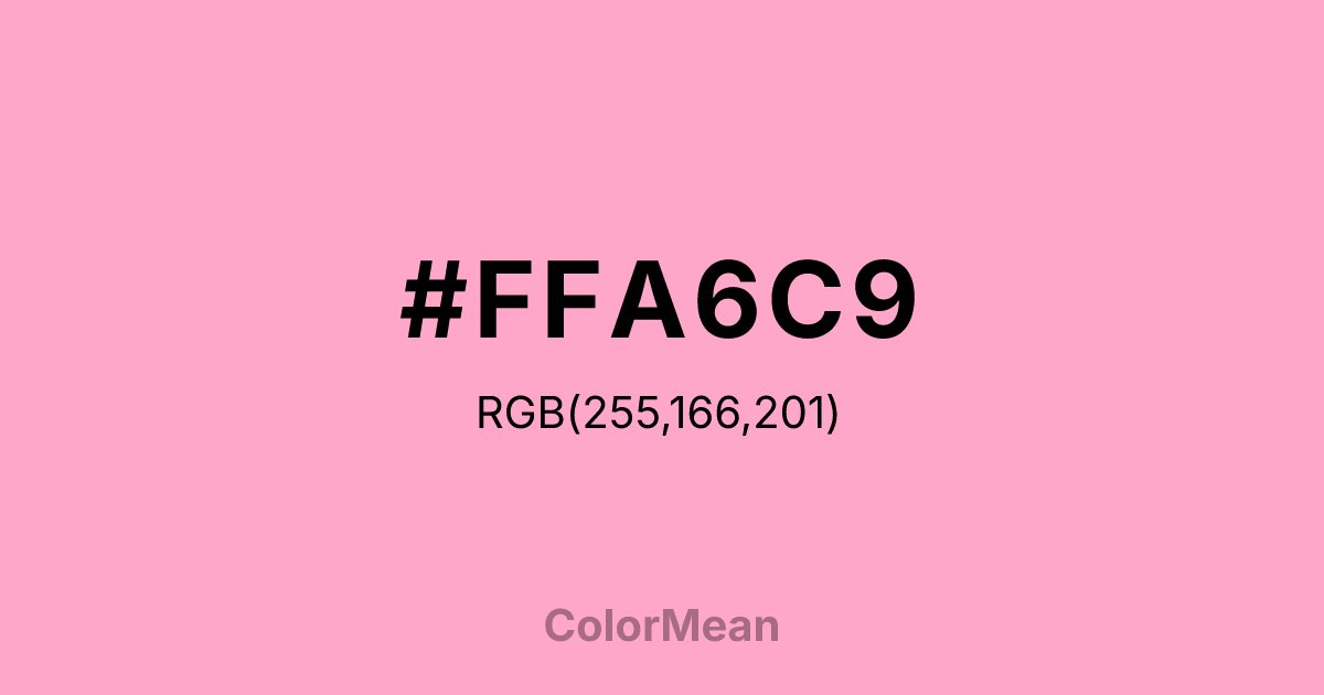 Carnation Pink (#FFA6C9) RGB value is (255, 166, 201). The hex color red value is 255, green is 166, and blue is 201. Its HSL format shows a hue of 336°, saturation of 100%, and lightness of 83%. The CMYK process values are 0%, 35%, 21%, 0%.