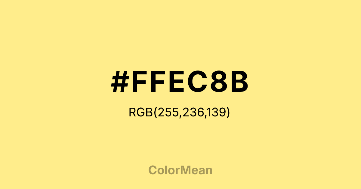 LightGoldenrod1 (#FFEC8B) RGB value is (255, 236, 139). The hex color red value is 255, green is 236, and blue is 139. Its HSL format shows a hue of 50°, saturation of 100%, and lightness of 77%. The CMYK process values are 0%, 7%, 45%, 0%.