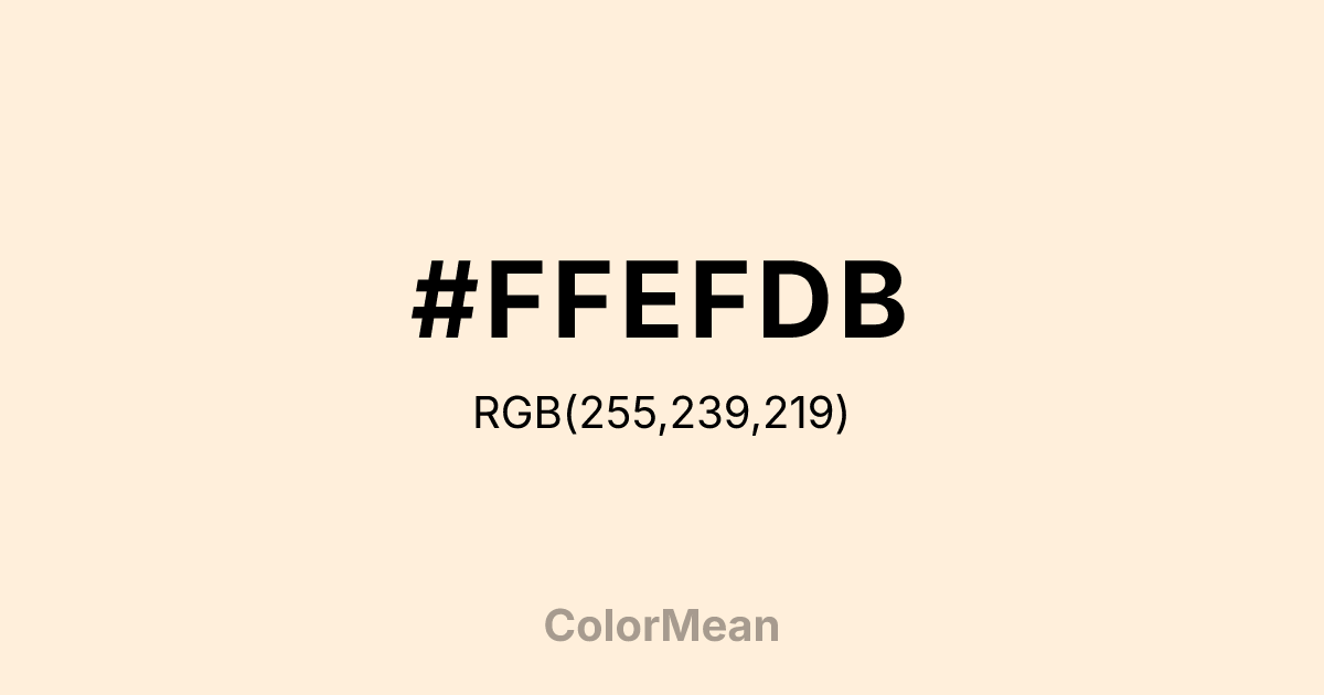 AntiqueWhite1 (#FFEFDB) RGB value is (255, 239, 219). The hex color red value is 255, green is 239, and blue is 219. Its HSL format shows a hue of 33°, saturation of 100%, and lightness of 93%. The CMYK process values are 0%, 6%, 14%, 0%.