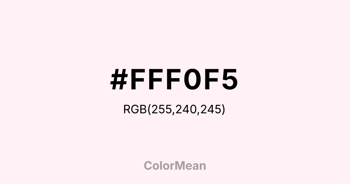 Lavender Blush (#FFF0F5) RGB value is (255, 240, 245). The hex color red value is 255, green is 240, and blue is 245. Its HSL format shows a hue of 340°, saturation of 100%, and lightness of 97%. The CMYK process values are 0%, 6%, 4%, 0%.