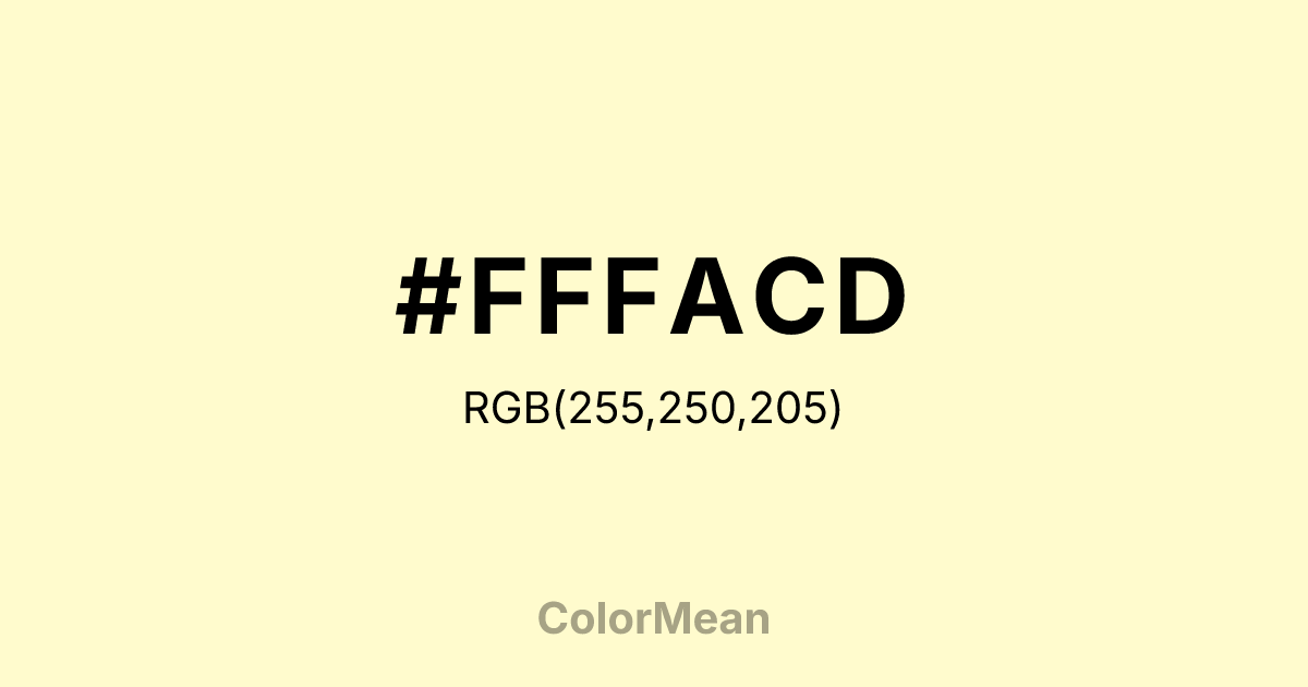 Lemonchiffon (#FFFACD) RGB value is (255, 250, 205). The hex color red value is 255, green is 250, and blue is 205. Its HSL format shows a hue of 54°, saturation of 100%, and lightness of 90%. The CMYK process values are 0%, 2%, 20%, 0%.